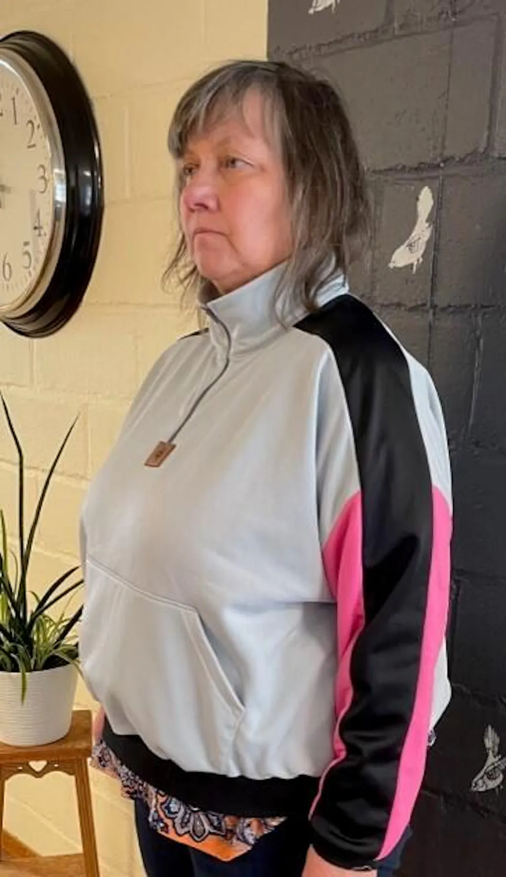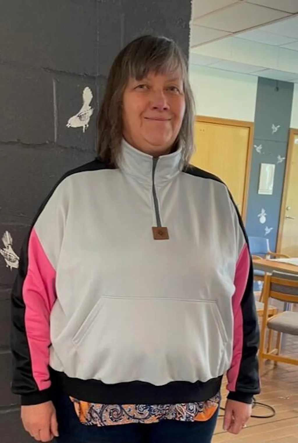 - Om du vill sy nederkanten med dragsko: en tvåhålig snörstopp och en resårsnodd, 2-3 mm i tjocklek och ca. längd: tröjans midjevidd, se storleksguiden, + 8 cm. Samt två öljetter (max 5 mm) och verktyg för att fästa dem, t.ex. Prymtång med rätt insatser.